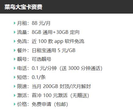 菜鸟大宝卡是小宝卡的升级版,通话时间3000分钟,月租略贵88元一个月,流量8GB通用+30GB定向,同样也是近百款app免流范围,这款菜鸟大宝卡是我觉得最适合外卖小哥使用的卡套餐之一,外卖小哥打电话频率数据是我做过工作对比后推荐的,3000分钟绝对足够使用了。