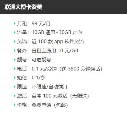 为了避免菜鸟大宝卡套餐都不足够使用的情况,所以我还是推荐一款比3000分钟略高通话的作为后备,这款联通大橙卡的通话时间3800分钟,月租99元一个月,流量10GB通用+30GB定向。
